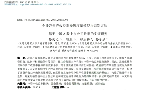 公司孙庆文教授和研究生靳玉的研究成果《企业净资产收益率操纵度量模型与识别方法——基于中国A股上市公司数据的实证研究》由《中国管理科学》期刊在中国知网上进行网络首发。
