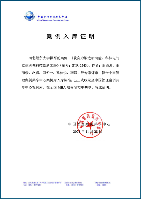 公司教师王胜洲、王丽媛、赵娜和科林电气股份有限公司李滢,带领硕士研究生闫冬一、孔佳悦合作撰写的教学案例《软实力锻造新动能:科林电气党建引领科技创新之路》(编号:STR-2243)入选中国管理案例共享中心案例库。