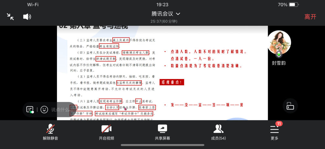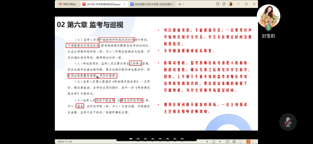 封雪韵聚焦《太阳成集团tyc539普通本科教学考务管理制度》,从考场规则、监考与巡视和考试纪律等3方面带领全体教师认真学习《制度》的第五、六、七章。她首先详细解读考场规则,对考场环境布置、考生座位安排、考试时间把控等细节进行明确规范,确保考试的严肃性与规范性。然后,她详细讲解了监考教师的监考职责与工作流程,从考前检查、证件核对,到考中监考、突发事件处理,以及巡视员的巡查重点与路线规划,确保全方位保障考试秩序。在考试纪律部分,她着重解读违纪和作弊的认定办法,帮助老师们清晰界定如携带违规物品、抄袭、协助作弊等各类行为的表现形式与判别标准,有利于大家准确把握尺度,做到纪律严明、评判有据。