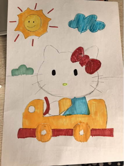 此次科创未来,青春行动云支教活动为我打开了一扇全新的窗户,我与宝方在未来绘画坊共同绘制Hello Kitty,开启了创意的碰撞与心灵的贴近。阳光透过棱镜玻璃在画纸上投下光斑,空气中飘着水彩笔的墨水香。我支起画板,旁边放着一筒带星星贴纸的彩色水彩笔。宝方抱着小兔子玩偶走来,双马尾随动作轻晃,看到水彩笔后拿起一支黄色的,笔杆被她捏出浅印。