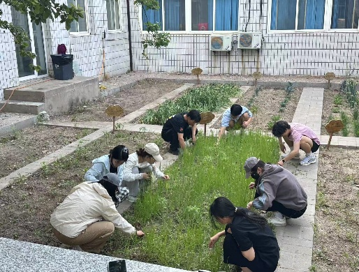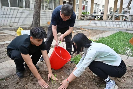 师生共同进行浇水施肥除草工作