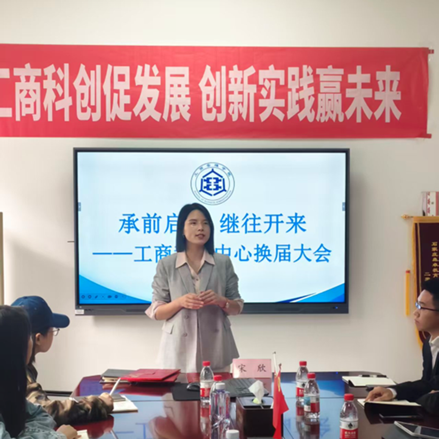随后,工商科创中心换届大会召开。宋欣书记在致辞中充分肯定了科创中心在“科研育人”方面取得的成果,对科创中心给予高度评价。她指出,科创中心自成立以来,不仅培育了一批具有创新精神和实践能力的优秀学子,更形成了良好的辐射带动效应,为推动全院科研氛围持续升温发挥了重要作用。她勉励新一届团队接过接力棒,传承科创精神,强化使命担当,以此次换届为新的起点,推动中心工作再上新台阶。