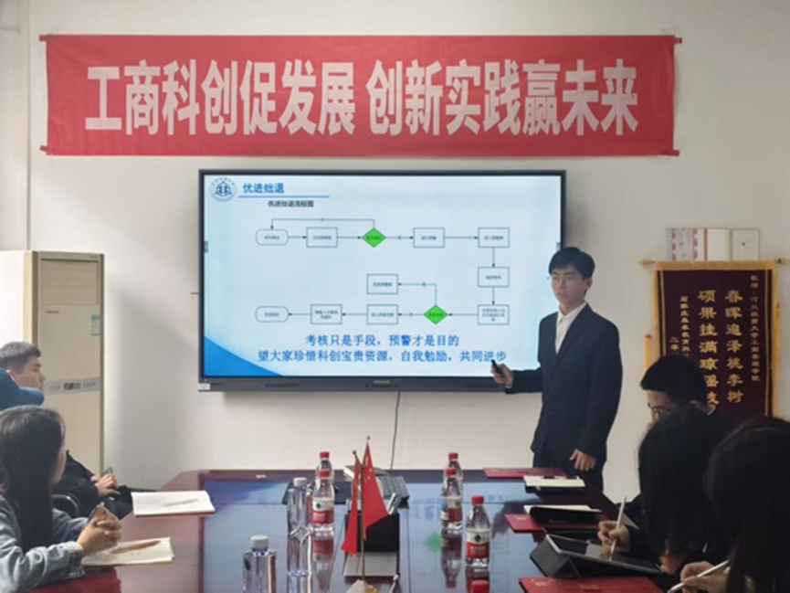 在中心主任陈浩的汇报环节中,他系统阐述了科创中心的组织架构与运行机制。作为公司重点打造的科研平台,中心采用“指导层—骨干层—育苗层”三级梯队管理模式,并明确了面向各年级的招募流程。他从“坚实基础、稳步引领、省赛认可、规模影响、综合展现”五个方面回顾了科创中心的成长历程,展现了中心“在实干中成长,在竞争中突破”的奋斗精神,并希望将科创中心打造为公司员工科研的中坚力量,为公司创造更大的荣光。