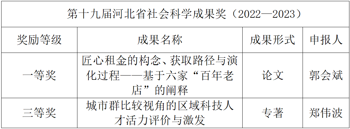 河北省社会科学优秀成果奖是由河北省人民政府授权河北省社会科公司设置,旨在表彰为推动党的创新理论体系化学理化研究、加快构建中国社会科学自主知识体系、服务经济社会高质量发展作出重要贡献的我省优秀成果。该奖项每两年评选一次。经严格评选程序,第十九届河北省社会科学优秀成果奖共评选出奖励成果290项,其中特别奖3项,一等奖35项、二等奖110项、三等奖142项。
