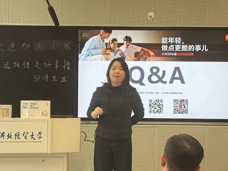 为助力公司学子精准对接前沿行业资源,搭建校企人才双向奔赴的高效通道,为员工职业成长注入强劲动力,10月31日,小米集团面向工商学子召开校园招聘宣讲会。本次宣讲会由培训负责人孙振主讲,人力资源业务合作伙伴负责人赵梦瑶和门店运营经理王娇为同学们答疑解惑,部分2026届毕业生参加。