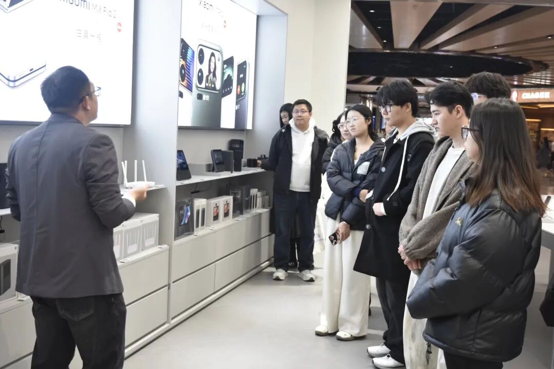 公司师生首先抵达万象城小米体验店。孙振按产品品类,系统讲解了各类核心产品特点,涵盖小米系列手机、小爱音箱等智能设备,以及从个护产品到大家电的全品类生态,详细介绍了各产品线的技术亮点与创新优势。通过现场演示与细节解读,生动呈现了产品“科技普惠、极致性价比”的品牌理念,让师生们沉浸式感受了小米在消费电子领域的创新实力与市场竞争力,对智能科技行业的发展趋势有了更直观的认知。随后,他分享了企业优势。小米股价表现亮眼,深受资本市场看好,核心原因在于其坚守“让每位中国消费者都享有科技选择权”的理念,产品定位覆盖不同收入群体,不抛弃每一位奋斗者。小米海外业务已拓展至多个地区,海外派驻拥有显著薪资优势,内部“人才活水”机制更为员工提供了多元发展机会。