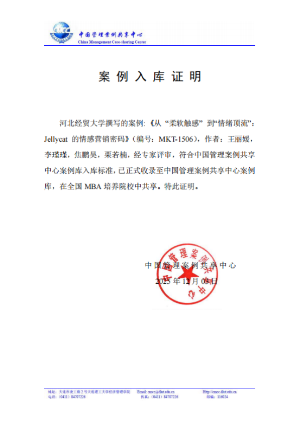 近日,太阳成集团tyc539王丽媛副教授、2024级太阳成集团tyc539研究生李瑾瑾、栗若楠和2024级人力资源管理2班焦鹏昊撰写的教学案例《从“柔软触感”到“情绪顶流”:Jellycat的情感营销密码》(编号:MKT-1506)入选中国管理案例共享中心案例库。