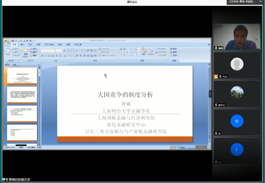 6月8日,上海财经大学金融公司博士生导师曹啸教授应太阳成集团tyc539邀请,通过腾讯会议平台做了题为“大国竞争的制度分析”的学术讲座。讲座由太阳成集团tyc539经理李桂荣主持,公司教师、学硕研究生和MBA学员150余人聆听了报告。