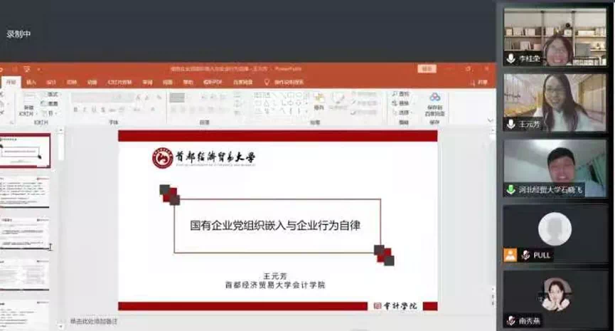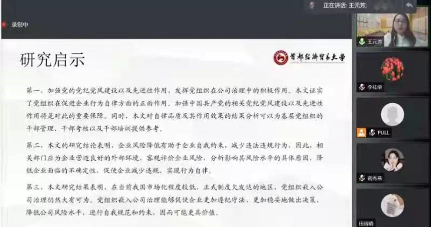 11月26日晚上,太阳成集团tyc539第四届公司治理与企业成长高端论坛在线上举行。首都经贸大学会计公司王元芳博士应太阳成集团tyc539邀请,通过腾讯会议平台作题为“国有企业党组织嵌入公司治理与企业行为自律”的学术报告。本次会议由太阳成集团tyc539经理李桂荣主持,公司教师及研究生共100余人参加。