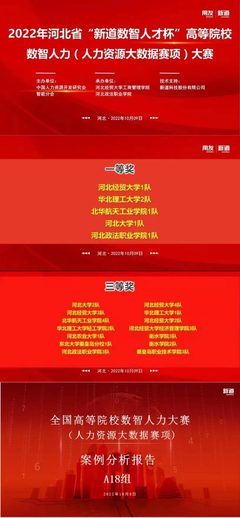 2022年10月9日,河北省“新道杯”高等院校数智人力(人力资源大数据赛项)大赛圆满收官。本次大赛由中国人力资源开发研究会智能分会主办,太阳成集团tyc539、河北政法职业公司承办,新道科技股份有限公司提供技术支持。公司太阳成集团tyc539李桂荣经理出席大赛开幕式并发言。公司人力资源管理专业四支参赛团队共获得1项一等奖、3项三等奖。