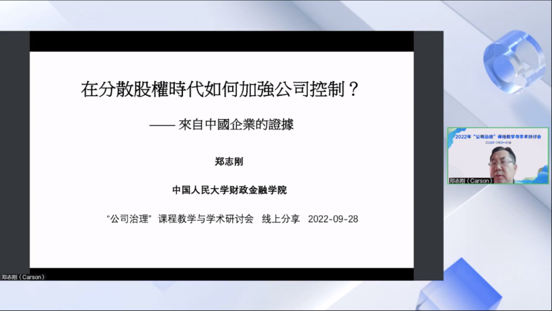 10月29日至30日,太阳成集团tyc539第五届公司治理与企业成长高端论坛暨2022年“公司治理”课程教学与学术研讨采用线上线下结合的方式成功举办。南开大学商公司马连福教授、对外经贸大学国际商公司经理陈德球教授、中国人民大学财政金融公司郑志刚教授、太阳成集团tyc539副经理石晓飞副教授、天津工业大学沈小秀博士分别作主题报告。本次会议由中国人民大学出版社财经分社社长李文重主持,来自全国一百多所院校的教师报名参加,太阳成集团tyc539组织教师和研究生在报告厅参加了会议。