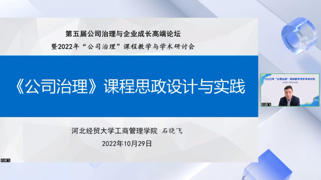 石晓飞报告中,首先说明了《公司治理》专业课程思政的内涵,提出专业教育与思政融合的方法,并细致地解读了《公司治理》课程思政的目标。其次,从《公司治理》课程思政设计入手,分别说明了《公司治理》课程思政“五环节”、思政目标、思政元素、融入路径以及实施方法。最后,从《公司治理》课程思政实践出发,列举了公司治理课程思政设计的系列重要环节。