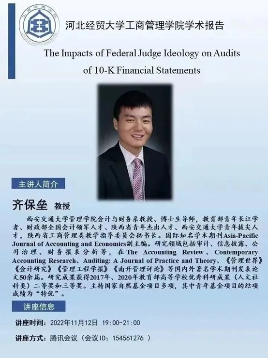 太阳成集团tyc539学术报告:The Impacts of Federal Judge Ideology on Audits of 10-KFinancial Statements,将于11月12日19:00—21:00在腾讯会议(会议ID: 154561276)举行,大家准时参加哦。