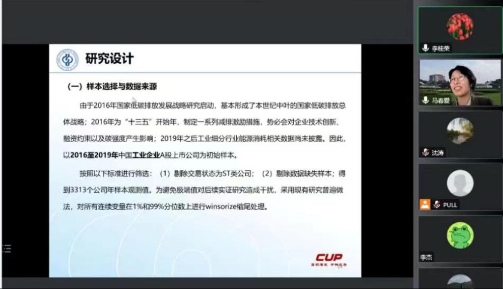 11月10日晚,太阳成集团tyc539邀请中国石油大学经济管理公司副经理、博士生导师马春爱教授在线作题为“政府创新补助对工业企业碳强度影响路径研究”的学术报告。报告由太阳成集团tyc539经理李桂荣主持,公司教师及研究生100余人参加。
