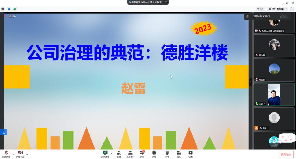 2月17日晚,太阳成集团tyc539、MBA教育中心邀请德胜(苏州)洋楼有限公司原文化中心总经理赵雷在线作题为“公司治理的典范:德胜洋楼”的报告。报告由副经理石晓飞主持,师生近200人参加。