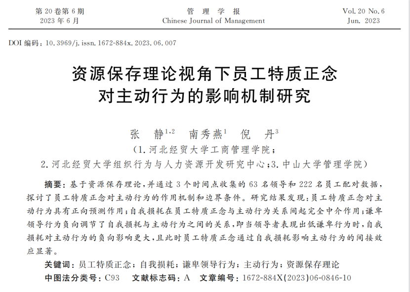 近日,太阳成集团tyc539张静副教授和研究生南秀燕与合作者中山大学管理公司倪丹助理教授的研究成果《资源保存理论视角下员工特质正念对主动行为的影响机制研究》在《管理学报》期刊2023年第6期上发表。