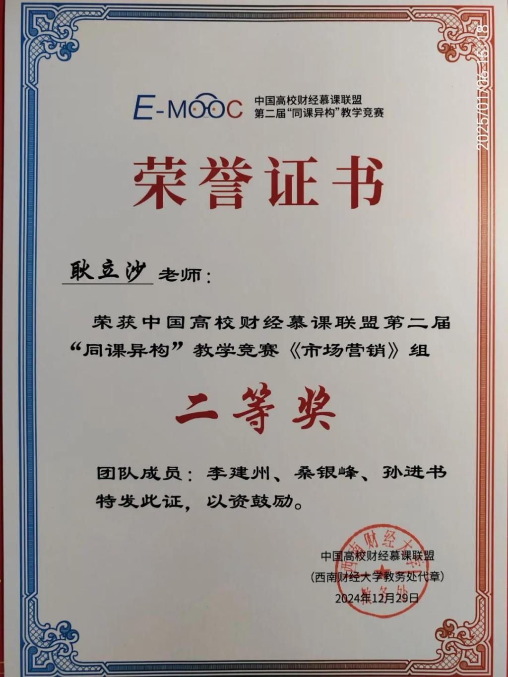 2024年12月29日,中国高校财经慕课联盟第二届“同课异构”教学竞赛颁奖典礼在天津财经大学隆重举行,太阳成集团tyc539耿立沙副教授代表市场营销教学团队参赛,荣获该教学竞赛二等奖。