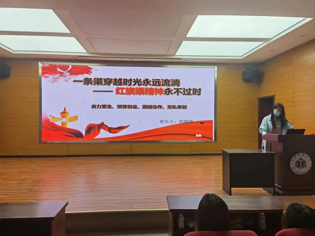 主讲人郭媛媛以“一条渠穿越时光永远流淌——红旗渠精神永不过时”为主题,从红旗渠的故事、红旗渠精神解析、红旗渠精神的现实意义及弘扬传承红旗渠精神四个方面进行了讲解。首先讲述了红旗渠的修建过程。30万林州人民苦战10载春秋建成了全长1500公里的“人工天河”——红旗渠;红旗渠是新中国两大奇迹之一,红旗渠的建成,结束了林州“十年久旱,水贵如油”的苦难历史;在红旗渠修建过程中孕育形成的“自力更生,艰苦创业,团结协作,无私奉献”的红旗渠精神,更是中华民族宝贵的精神财富。随后,对红旗渠的精神进行了解析。“人民利益高于一切,是红旗渠精神的根本立足点”,中国共产党从人民的根本利益出发,想人民之所想,急人民之所急,全心全意为人民办实事,从而创造出人间奇迹,形成了宝贵的红旗渠精神;广大群众在自我实践、自我教育中懂得了“为谁修渠,怎样修渠,宁愿苦干也不苦熬;宁愿眼前吃苦也要换来长久幸福;宁愿自力更生、群策群力也不等靠要,不单纯依赖国家。”党组织实实在在的思想贯穿于整个修渠过程,全县干部身先士卒,发挥了模范带头作用;修建红旗渠十年,没有发生一宗请客送礼,挥霍浪费的情况,也没有一个干部贪污挪用建渠物资。再次,展示了红旗渠精神的现实意义。弘扬红旗渠精神有利于加强思想道德建设、贯彻“三个代表”重要思想、铭记两个务必,端正党风、政风。最后强调,我们应当弘扬与传承红旗渠精神,同时必须高度重视对各级领导干部的教育;要把弘扬红旗渠精神同向焦裕禄、孔繁森、吴金印、郑培民、史来贺等优秀干部学习结合起来,牢固树立做人民公仆、为人民服务的宗旨。
