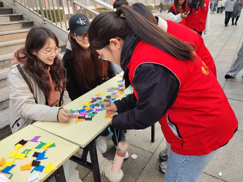 活动伊始,张芷璐组织支部成员开展了志愿服务活动,大家身着统一服装,手持工具,共同清理银杏树下的落叶和杂物,以实际行动践行绿色环保理念,为营造美丽的校园环境贡献青春力量。随后,大家共同参与了“我爱中国”打卡活动,真诚地在小旗上写下了对伟大祖国的深情寄语。祝福随风飘扬,银杏叶随风飘落,爱国之情与自然之美相互交融,爱国情怀愈发深沉浓厚。紧接着,大家共同参观了非遗特色展演,近距离欣赏剪纸、糖画等精美作品,积极体验制作过程,感受传统手艺的独特魅力和中华优秀传统文化的博大精深,深刻认识到了传承和弘扬中华优秀传统文化的重要意义,更加坚定了守护民族精神家园的信念。